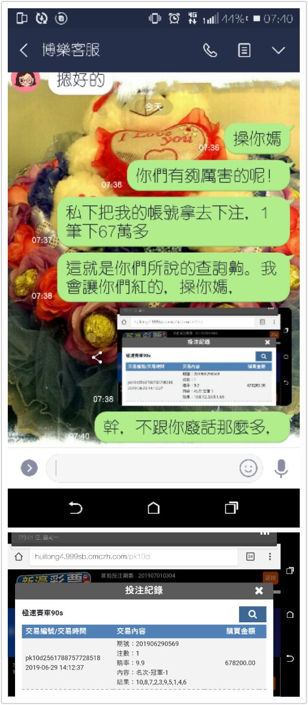 續之前的,真的有夠誇張的,最先不給提領(注單異常待查詢),再來說使用套利程式(鎖帳號),最精彩的來了,帳號鎖了接近半個月居然解鎖了,查詢了注單,平台主動幫你下注,這還不夠精彩,精彩ㄉ是注單查詢到1筆(賽車單買1個冠軍號碼買了678200),OMG,這要是幸運的開出來,可以買房子了。不得不佩服這間娛樂城(博x,x樂)