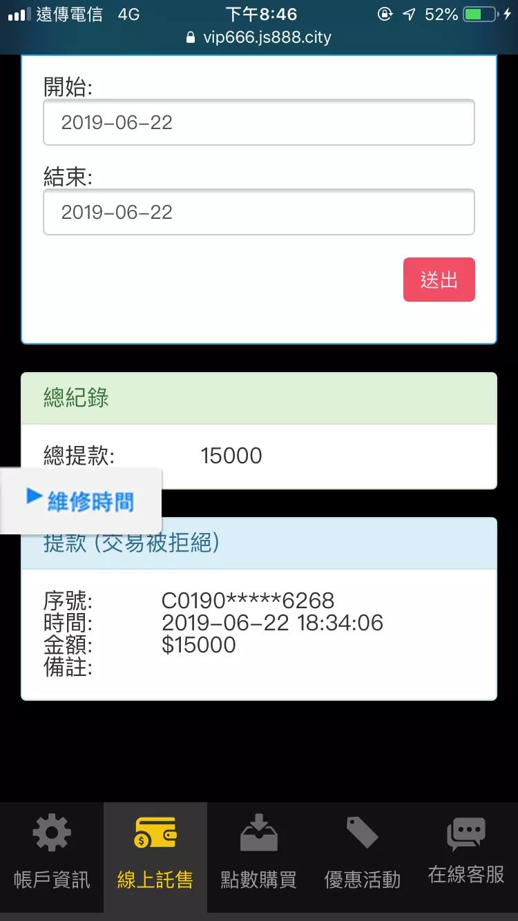 我使用平台是捷費德,此張圖照片是捷費德的新網站,我儲值1000元,客服說洗馬量要過20倍,我申請提領21000,一開始說一天工作天,第二次說假日不出款,第三次說風控部在審核,第四次說有人用平台洗錢,一直沒等到出款,結果整個平台消失,問客服客服說在維修,過不久後直接給我新網站,我是給人傭金去代操的,前前後後給了9500左右,現在人也消失,很著急