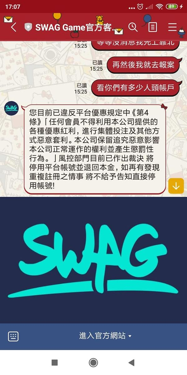 給各位看看輸不起的娛樂城,swag娛樂城,輸的時候都沒風控,贏一些就來風控,晚點來報警跟他們玩,還穩定出金,10000就輸不起了,附上他們的虛擬詐騙帳號!!!!!!