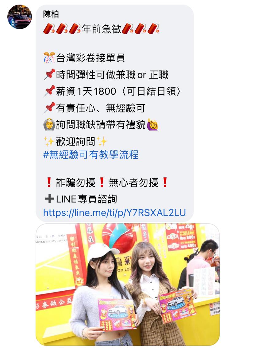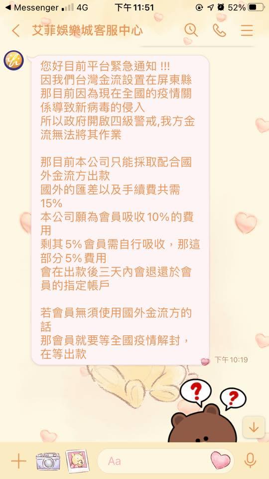 前提:我是抱著實驗精神去做這件事,請勿當酸民謝謝(剛開始就像臉書圖片那樣說,說是正規的合法政府平台台灣彩券,後來話術了一堆,跟我保證1000只是開通費,可以馬上領回,結果儲進去才發現,是娛樂城==然後我要馬上提領出來的時候,客服就說我下注量沒到達,是要使用他們的平台洗錢嗎?後來我請他們駁回我的申請,我重新去投注,滿1000了,還有1750可以提領,結果要提領的時候客服就封鎖我,連打字都不能,那個A先生也封鎖我,消失的無影無蹤,只想提醒大家!要先繳錢的都是詐騙!然後娛樂城叫「鋒澐」在這裏祝福詐騙集團都不得好死🥰