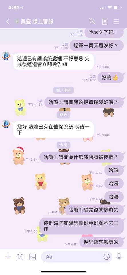 被美盛騙差不多5萬,提醒各位不要被騙了。一開始小金額的確會讓你提領,等你參加完他們所謂的專案,他們就不給你提領了,連退單也拖拖拉拉不給退,之後甚至把你的帳號停權了,客服也開始不讀不回了。