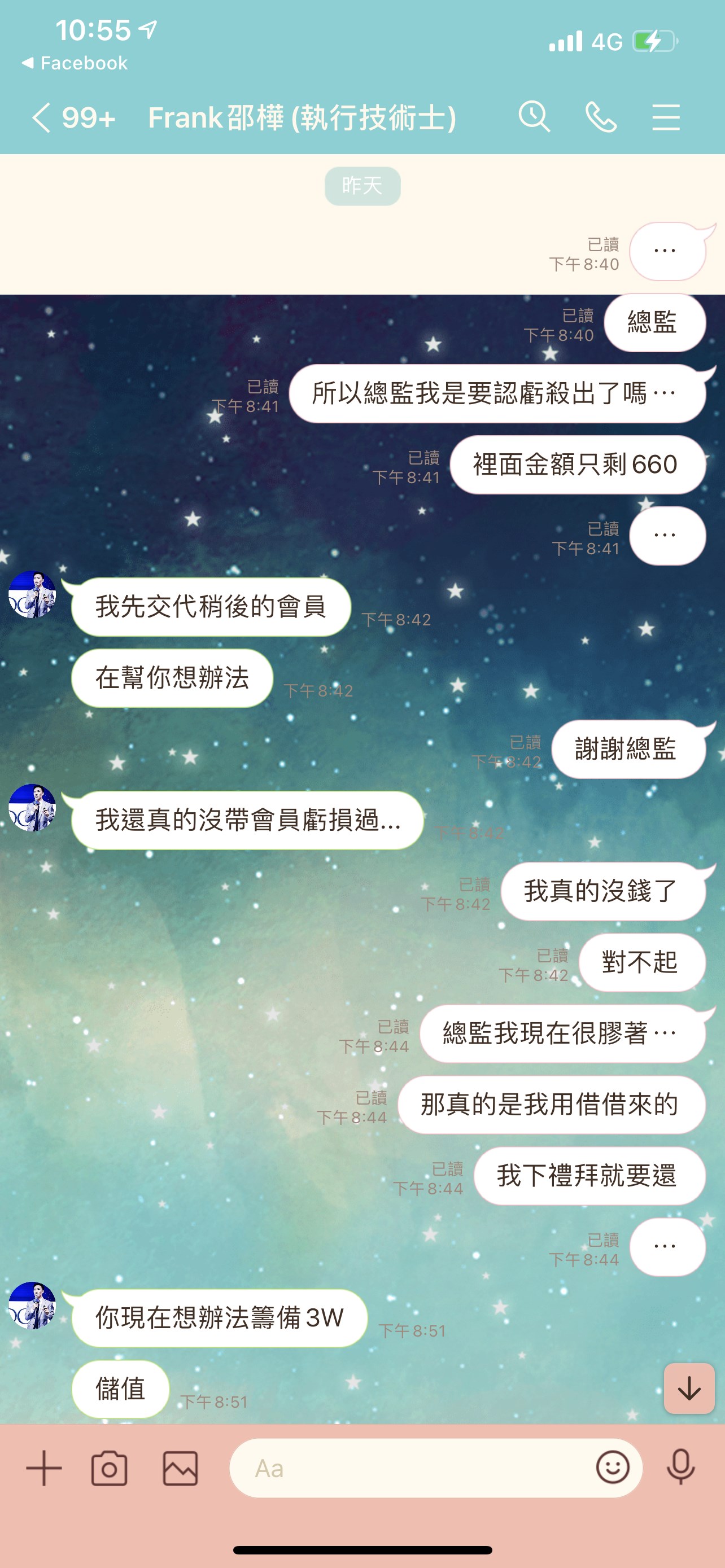 想請問參加皇家,結果秘書主動說要幫我,她自己儲值一半,結果後來獲利還要我先繳錢,結果網站顯示是IP風險,要找工程師解決,要我先付錢,我回真的有困難,結果過了一個多月,這個秘書助理先把賴給刪除,說是換手機,接著用新的帳號來跟我要錢,叫我還錢,還找一個號稱她同學徵信社的說我不還錢就進入法律程序,我到底該怎麼辦