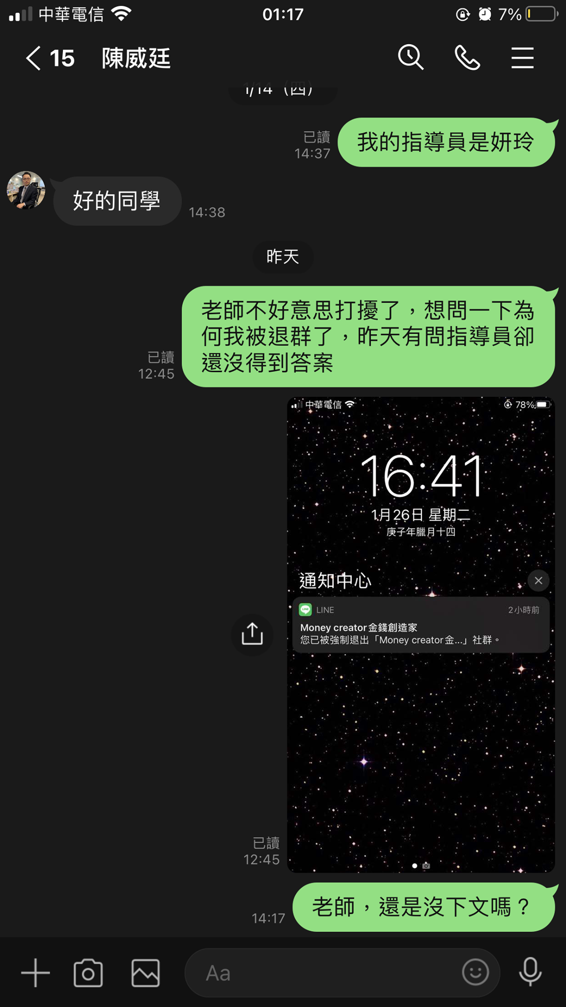 1/27 早上登入網頁時,卻顯示帳密不對:中午跑去問客服卻沒回我,之後跑去問社群的老師被退出原因,老師已讀我卻沒回我,我不死心又去問一次,但就是沒回我