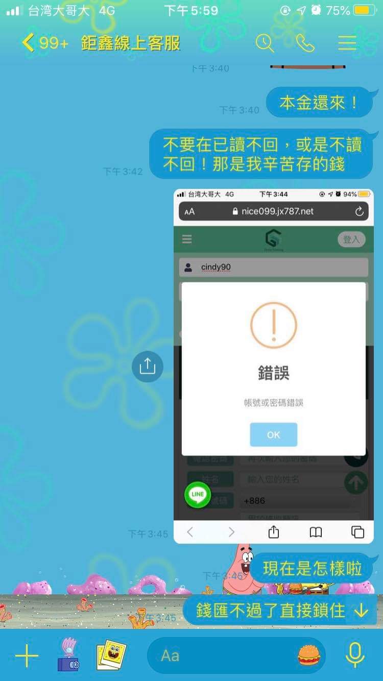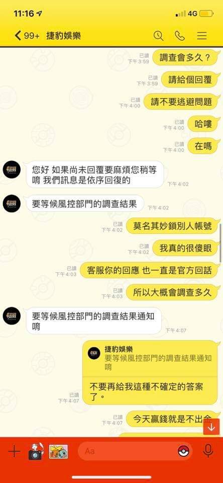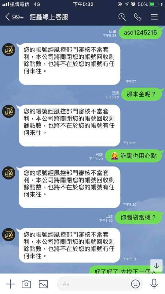 因為我沒匯給他後續場次沒辦法繼續,那你們公司也要倒閉了吧,他說:我現在沒馬上匯給他會害他倒賠很多錢$,我傻眼我才倒賠3000塊吧⋯⋯整個無言,昨天提領今天帳號被鎖..這些人真的會有報應!到處詐騙很多人