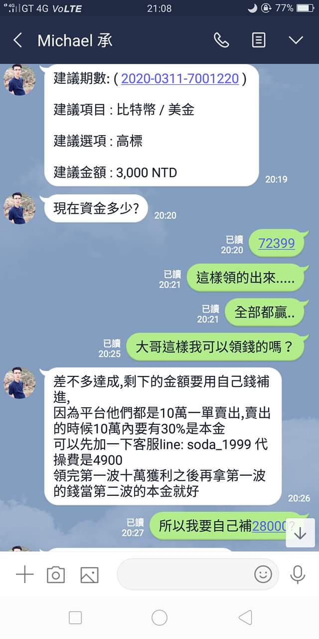 這些詐騙集團手法話術真的是很厲害,昨天3000直接被騙,後續完玩之後有賺三千多,帶我的這個人說這邊要跟妳收費$2800