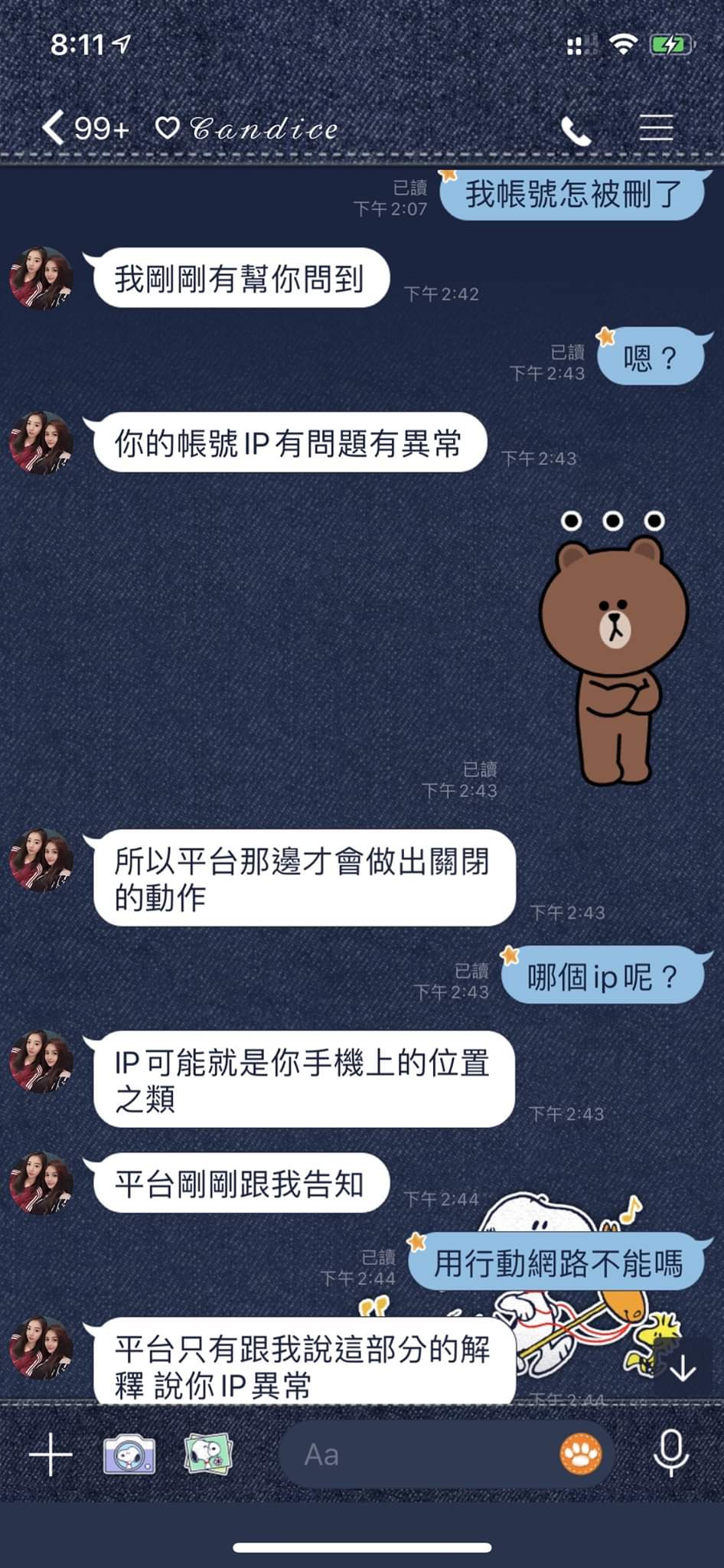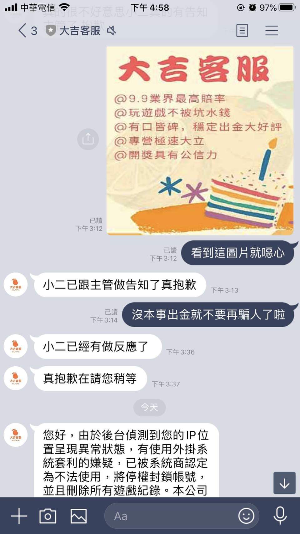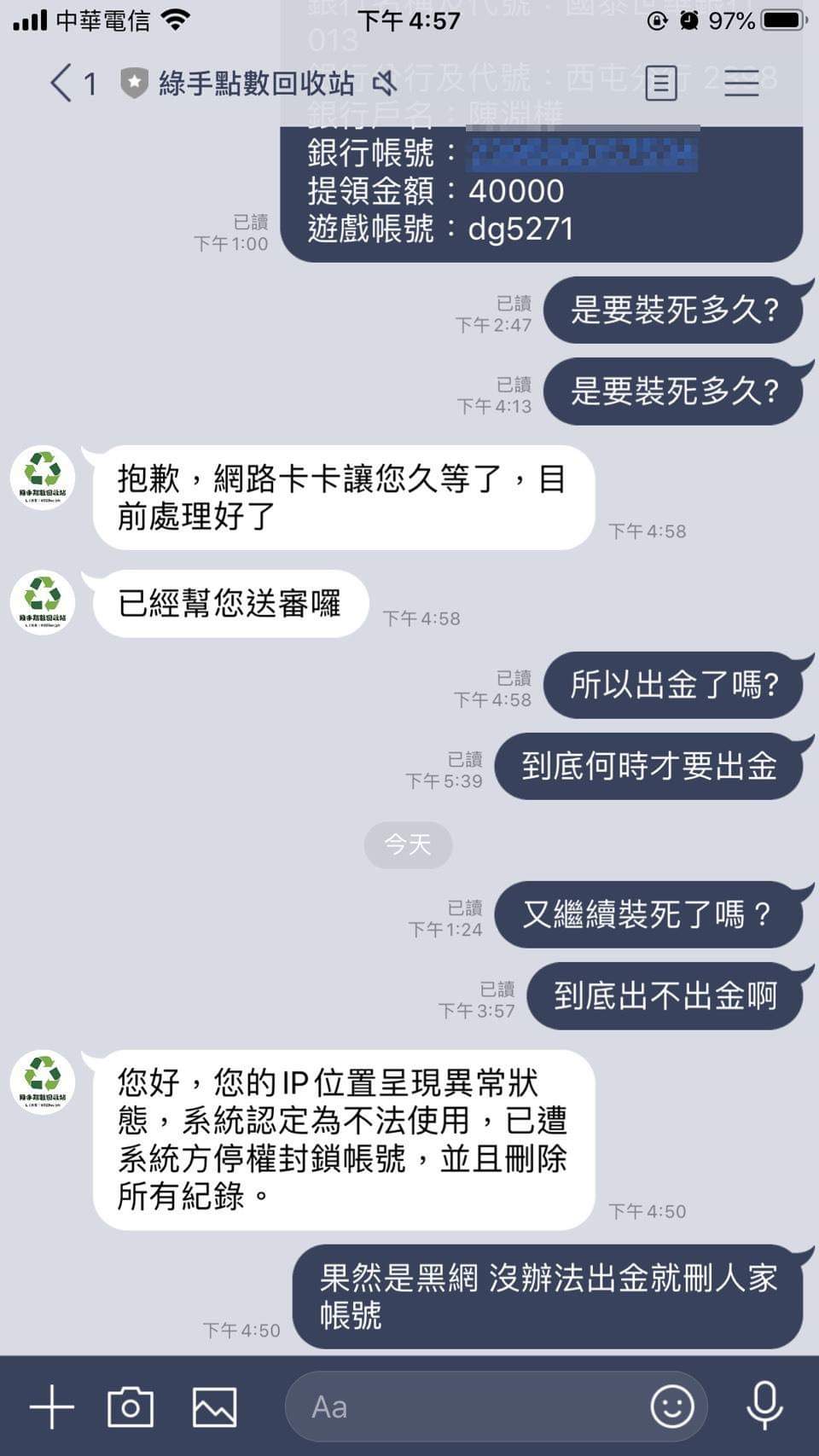 大家來看哦 先是裝不在線 不讀不回 偶爾回一下又消失無影無蹤 然後說幫你送審了 又繼續搞消失 最後直接說你ip異常直接鎖號