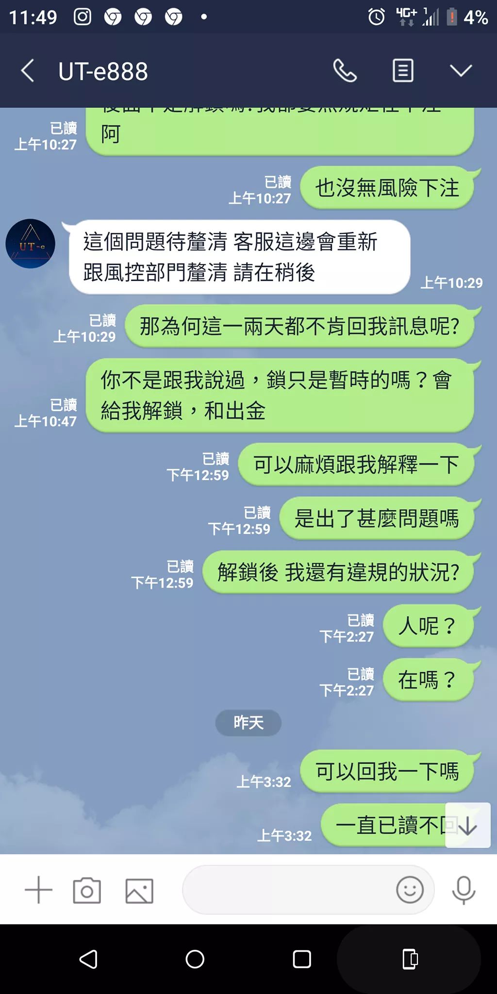 UT-e智慧投資理財,不給出金,還停權鎖人帳號,輸不起就別開娛樂城了,媽的貢丸,我有幾個朋友跟我一樣都被停權了,客服都不讀不回躲起來了,也有人也這樣情形嗎?